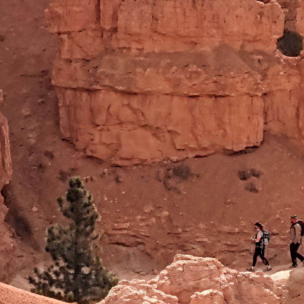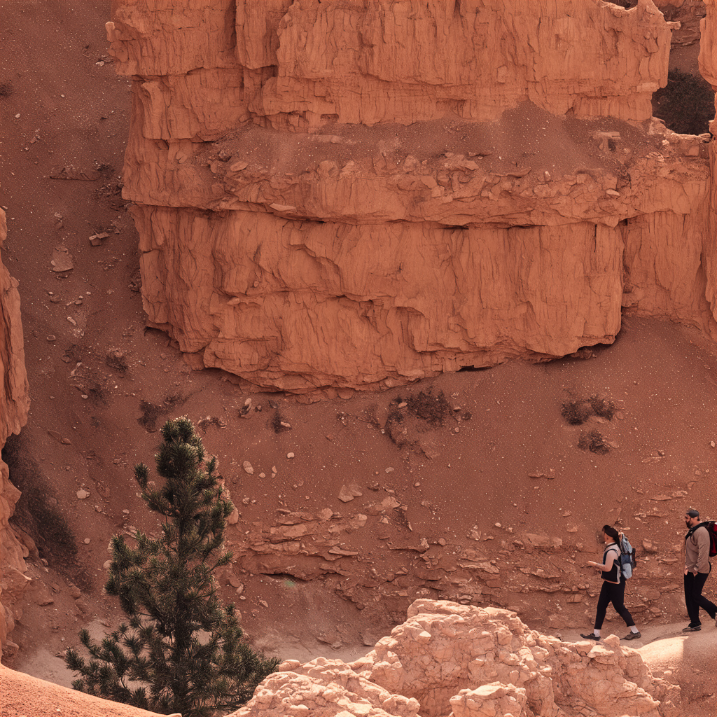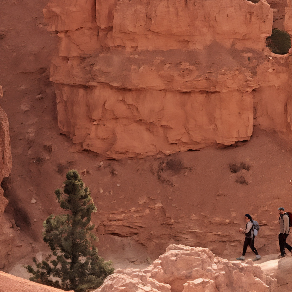 reddish-orange sandstone cliffs. A small evergreen tree grows in the foreground near the base of