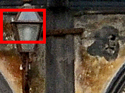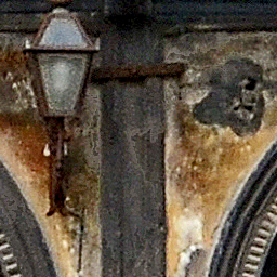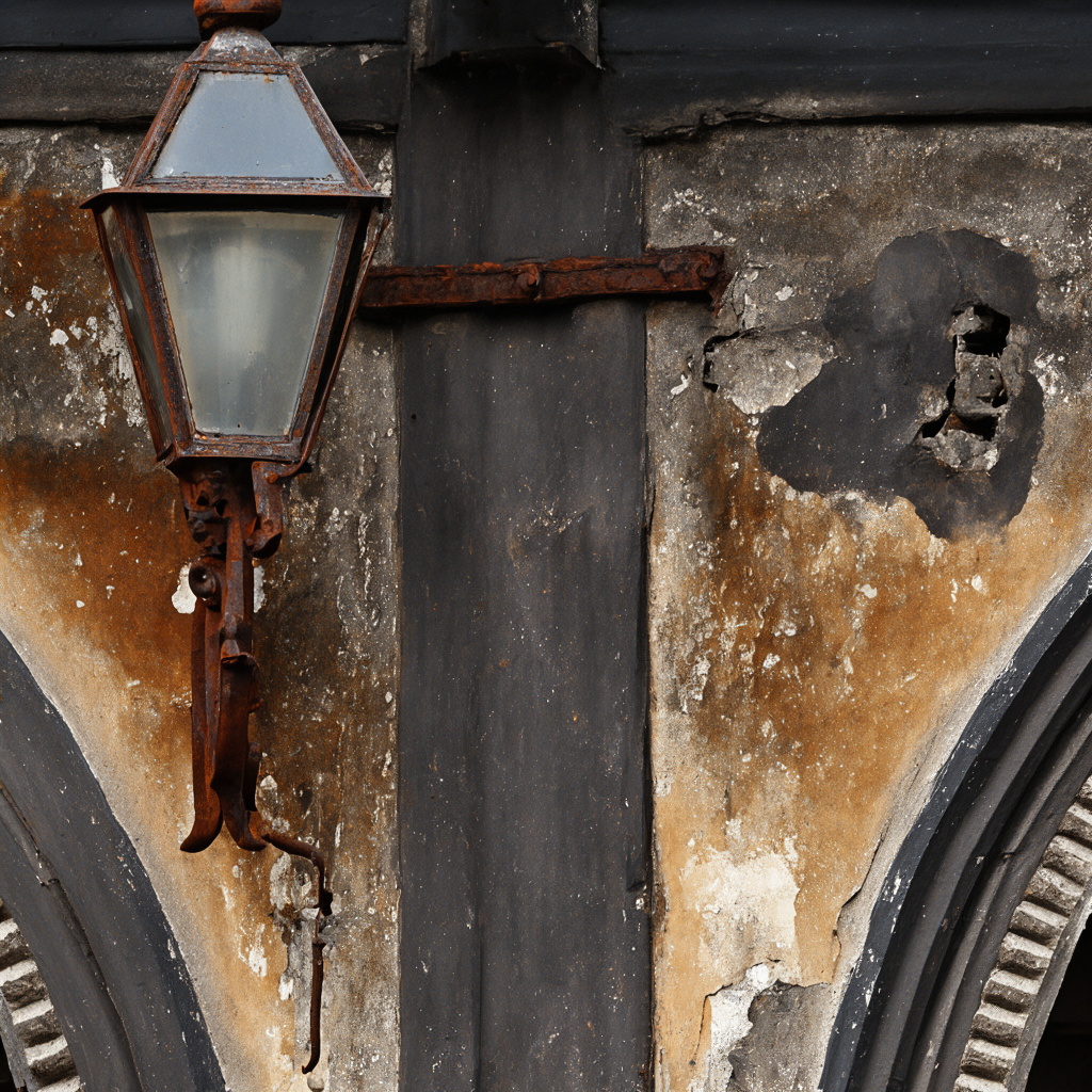 rusty metal lamp is mounted on a dark vertical beam against a crumbling ochre and brown stucco