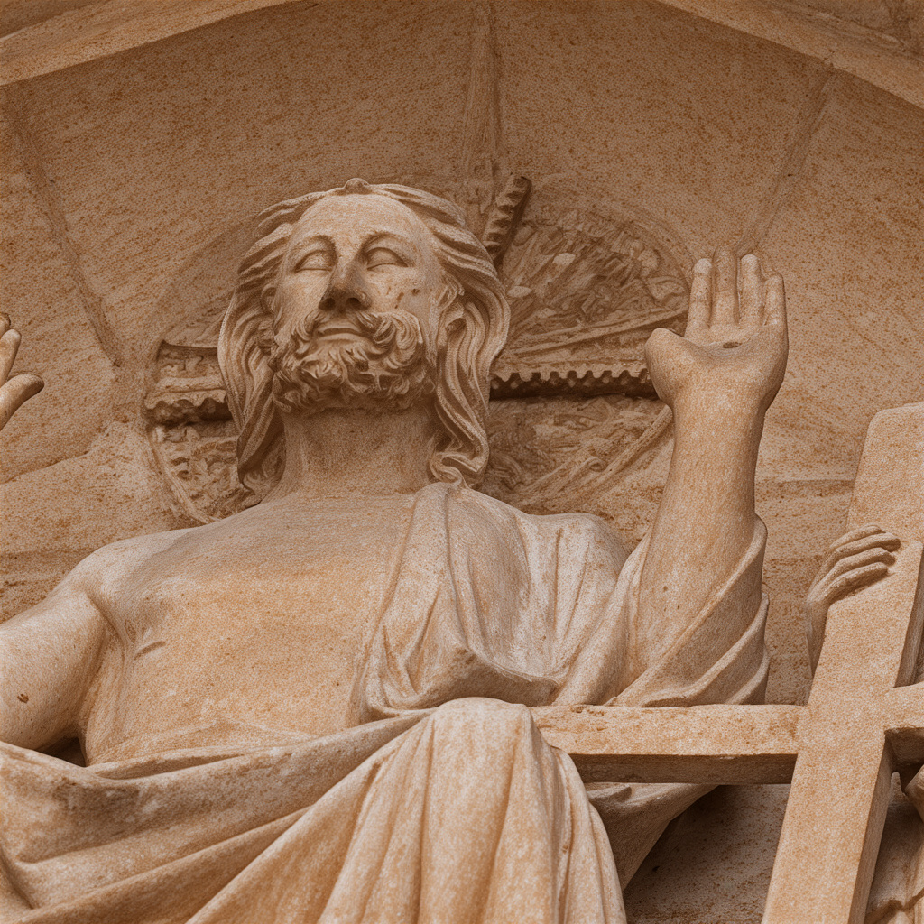 sculpture depicts Jesus Christ seated, his hands raised in a gesture of blessing \dots