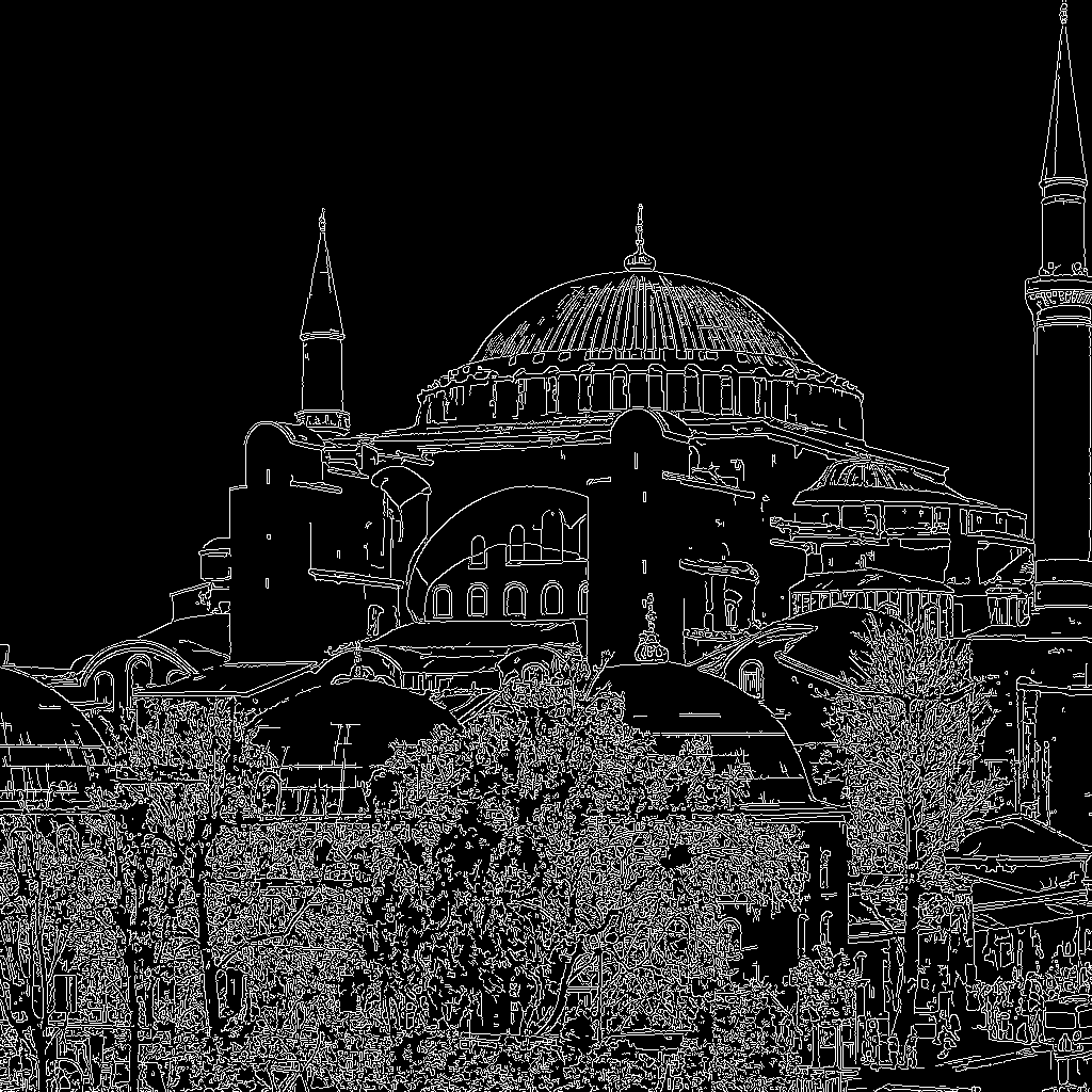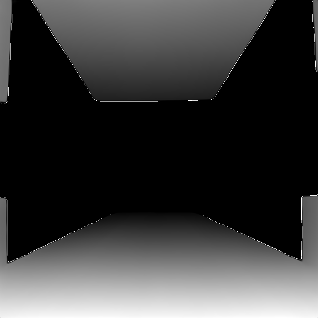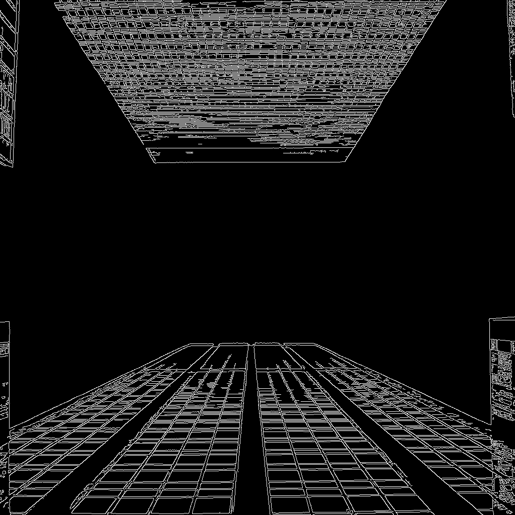 Photo of skyscrapers viewed from below, black and white. The image features three tall buildings, two on the sides and one dominating the lower half. The composition is symmetrical, with the buildings framing a bright white sky. The style is minimalist, emphasizing geometric lines and textures.