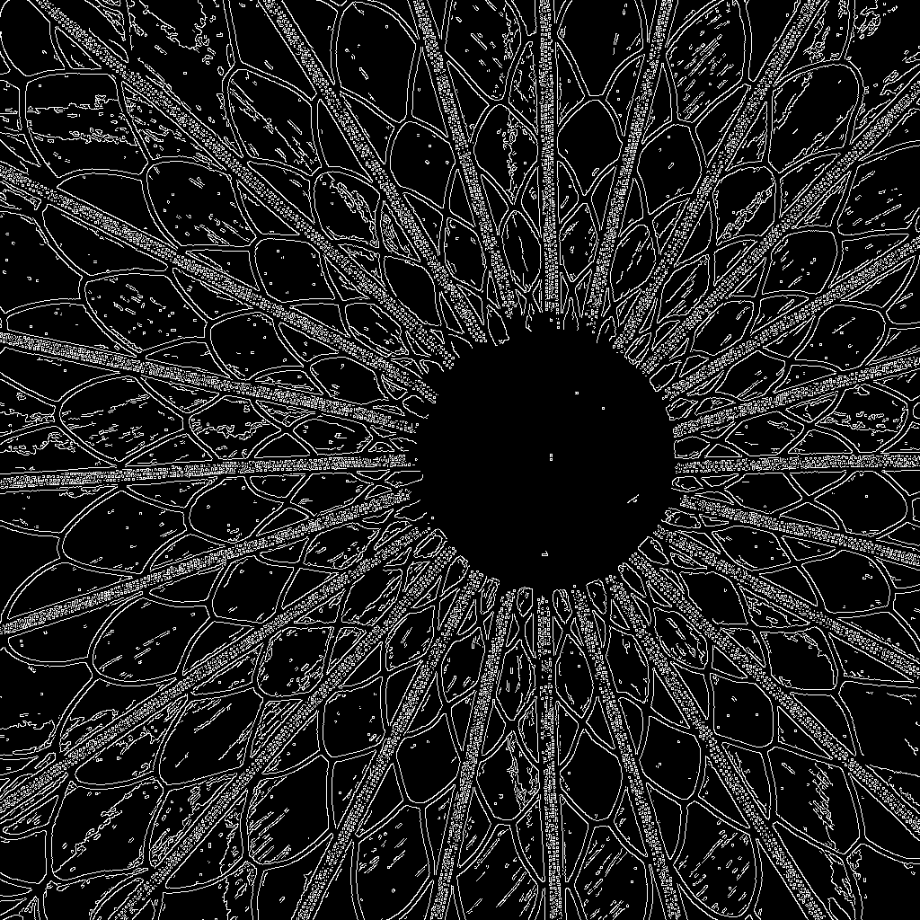 Photo of a stained-glass ceiling, circular composition. The ceiling features a radiating pattern of yellow, white, and gray stained glass panels. Dark brown central element acts as a focal point. The style is Art Nouveau, detailed lines, and intricate design.