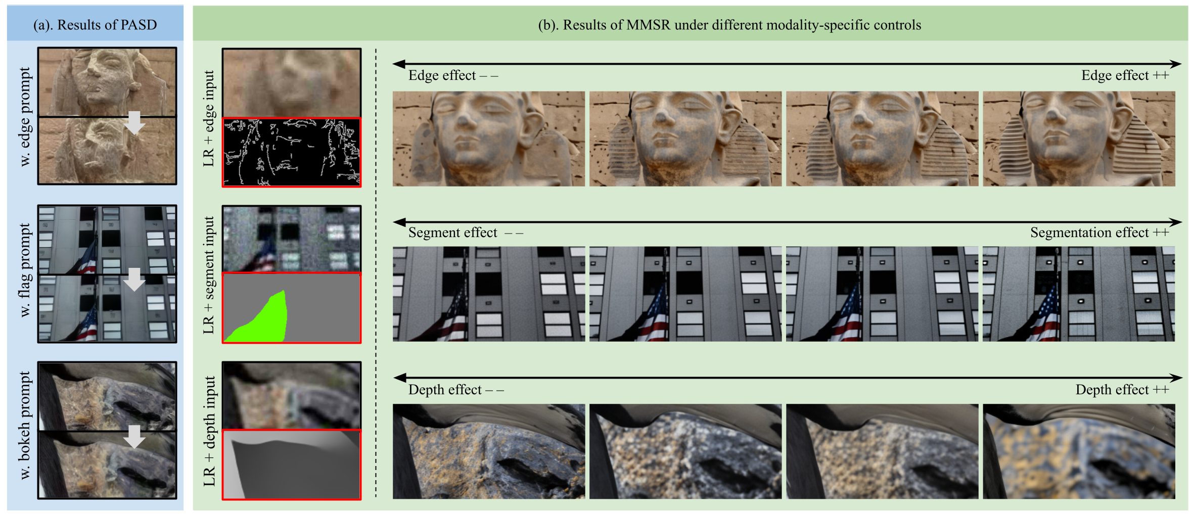 Our method allows for fine-grained control over super-resolution results by adjusting the influence of each input modality. For example, reducing the edge temperature enhances edge sharpness (first row). Lowering the segmentation temperature emphasizes distinct features, such as the star pattern on the flag (second row). Decreasing the depth temperature accentuates depth-of-field effects, like the bokeh between the foreground and background (third row).