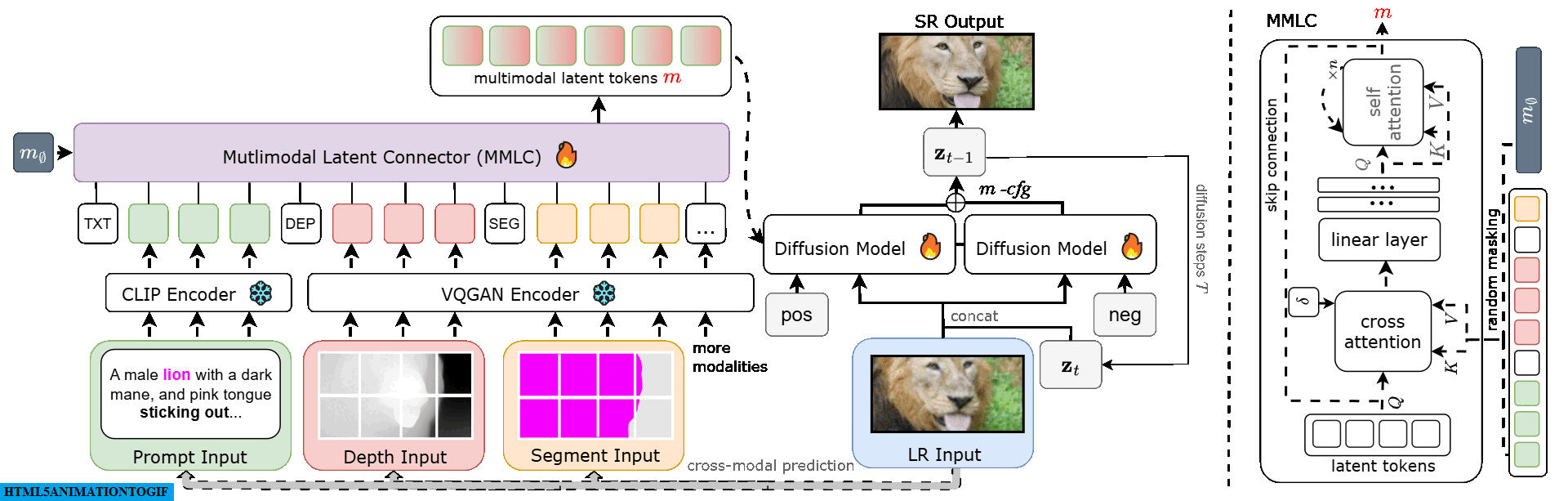 Starting with a low-resolution (LR) image, we extract modalities like depth and semantic segmentation maps. These modalities are encoded into tokens and transformed into multimodal latent tokens ($m$). Our diffusion model uses these tokens and the LR input to generate a high-resolution (SR) output. A multimodal classifier-free guidance m-cfg refines the SR image for enhanced quality.