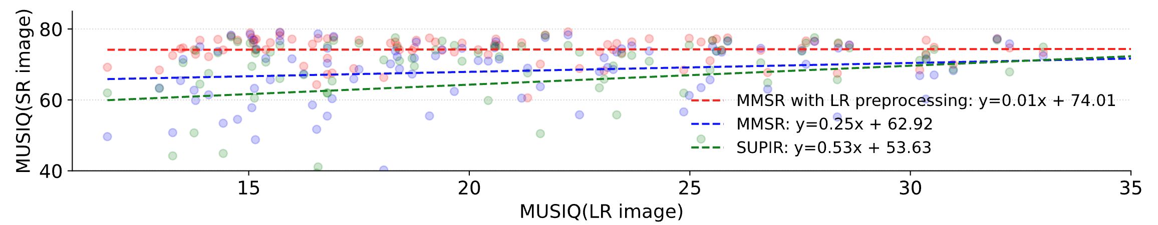Our LR pre-processing effectively mitigates the impact of inaccurate multi-modal data in low-quality input images (low MUSIQ LR score), ensuring consistent SR performance. The resulting scatter plots, characterized by a shallow slope and high y-intercept, confirm the method's stability and resilience to low-quality LR inputs.