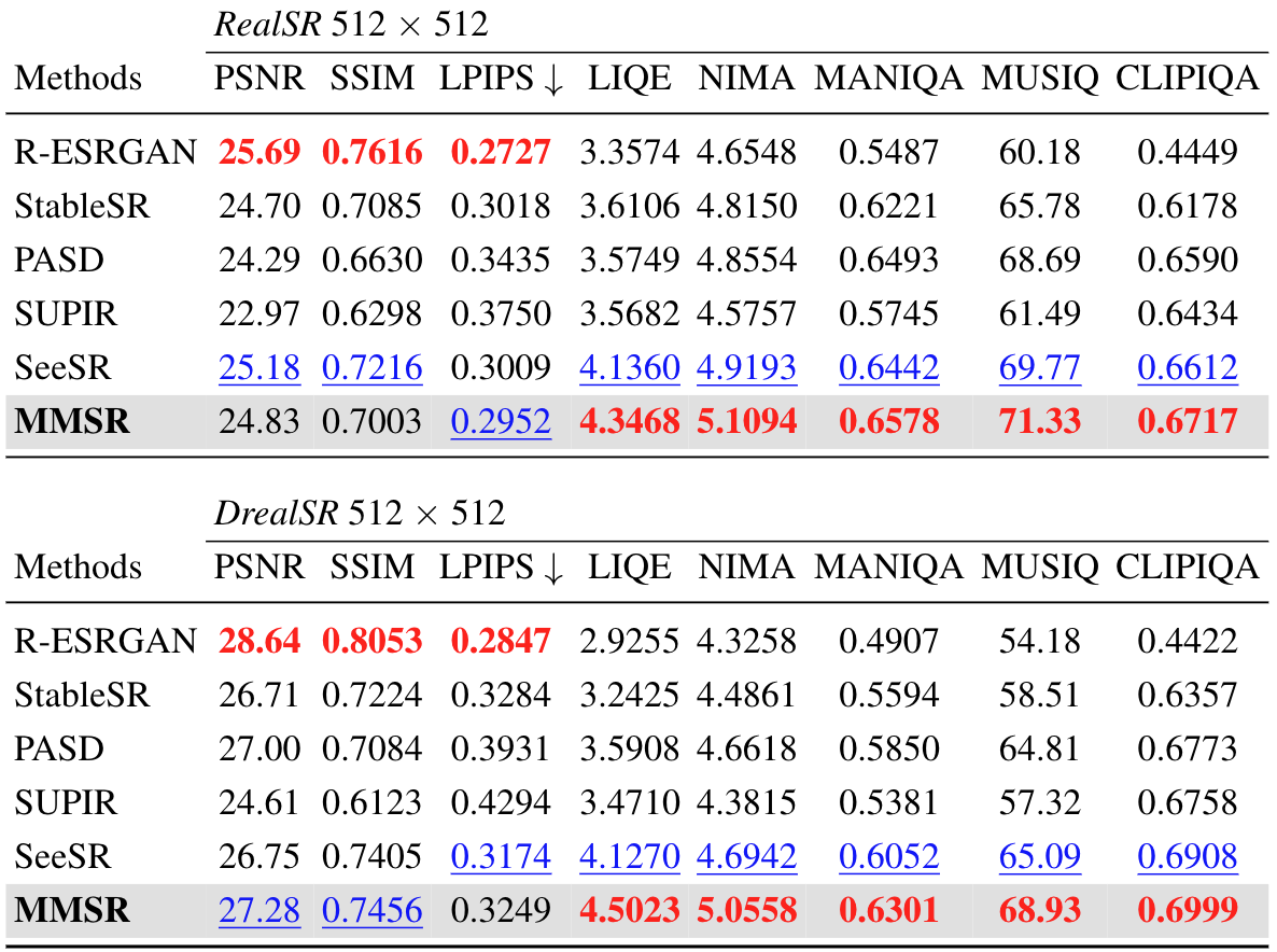 Severely degraded, low-resolution (LR) images can produce inaccurate multi-modal information, manifesting as distorted edges, misidentified objects, and other artifacts. To further illustrate the robustness, the figure below shows the behavior of each method and strategy on different qualities of LR images, as measured by MUSIQ.
